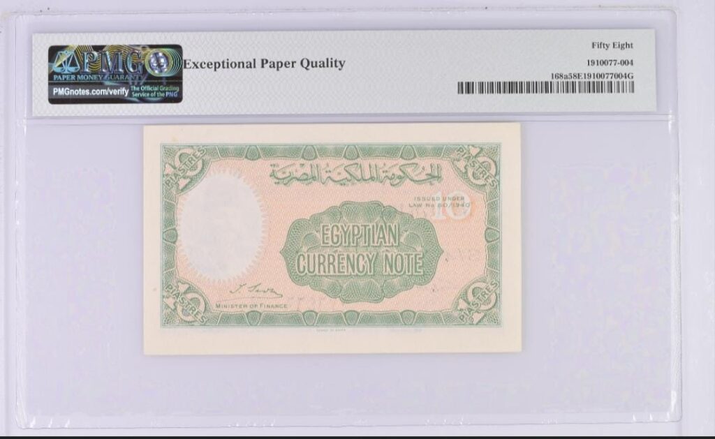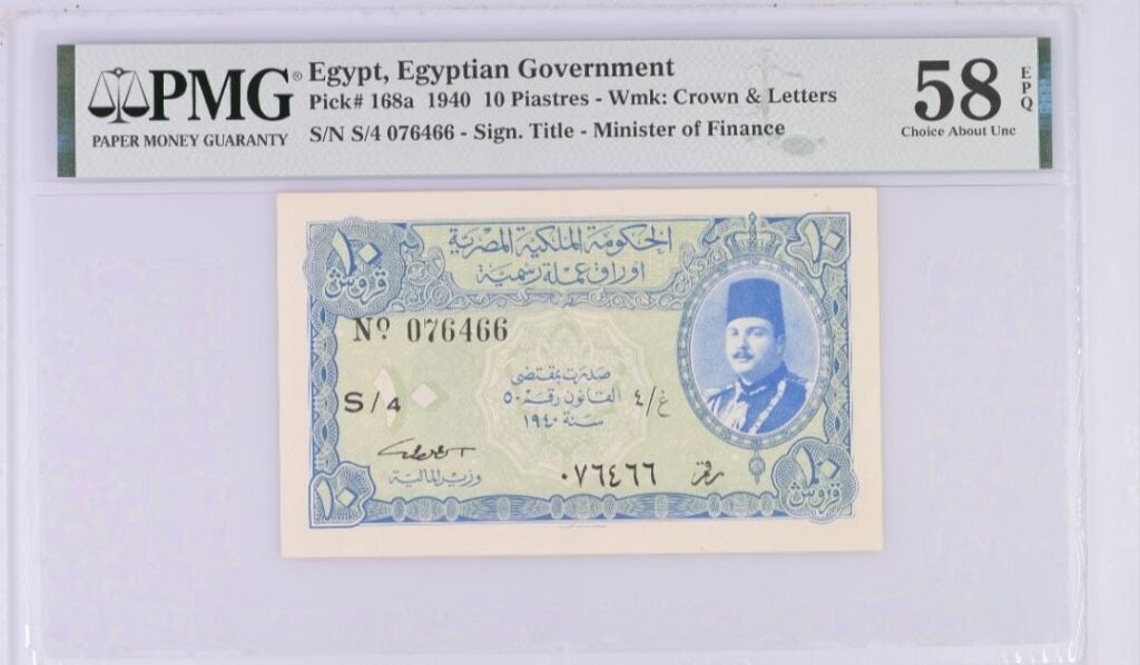 10 Egyptian Piastres King Farouk 1940 graded by PMG 58 EPQ