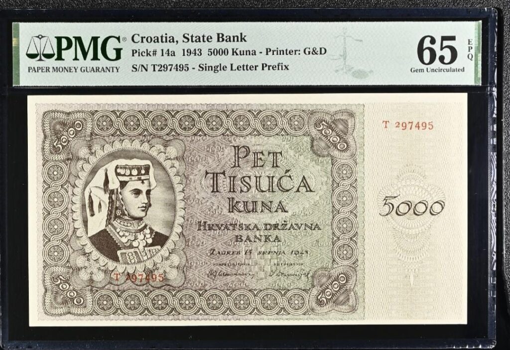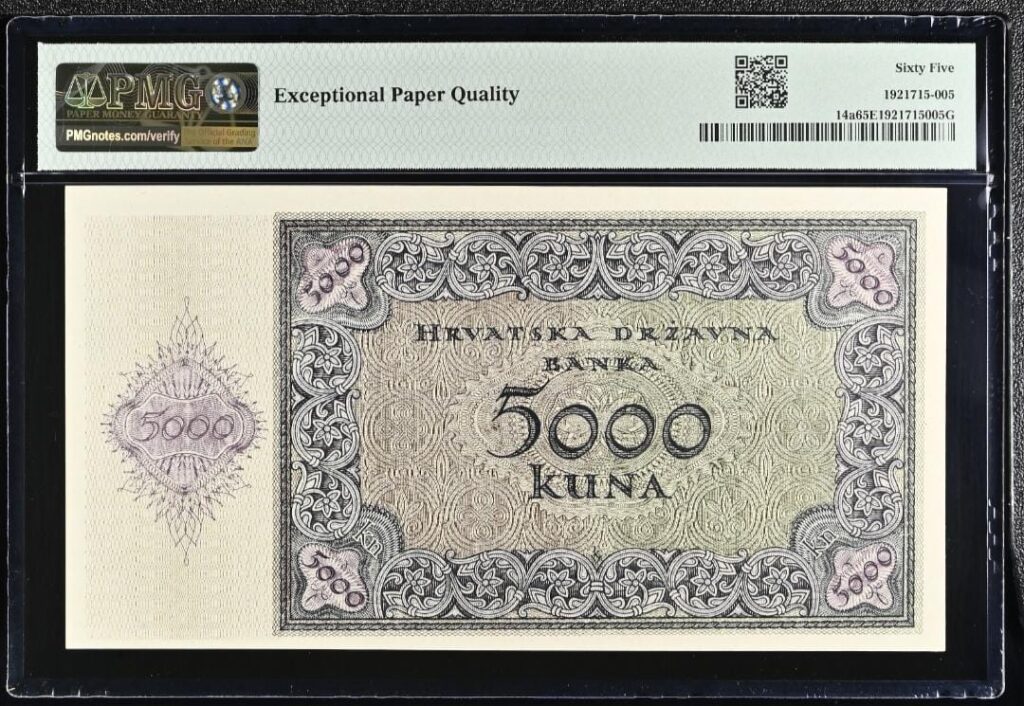 Croatia State Bank 5000 Kuna – WW2- dated 1943 graded by PMG 65 EPQ